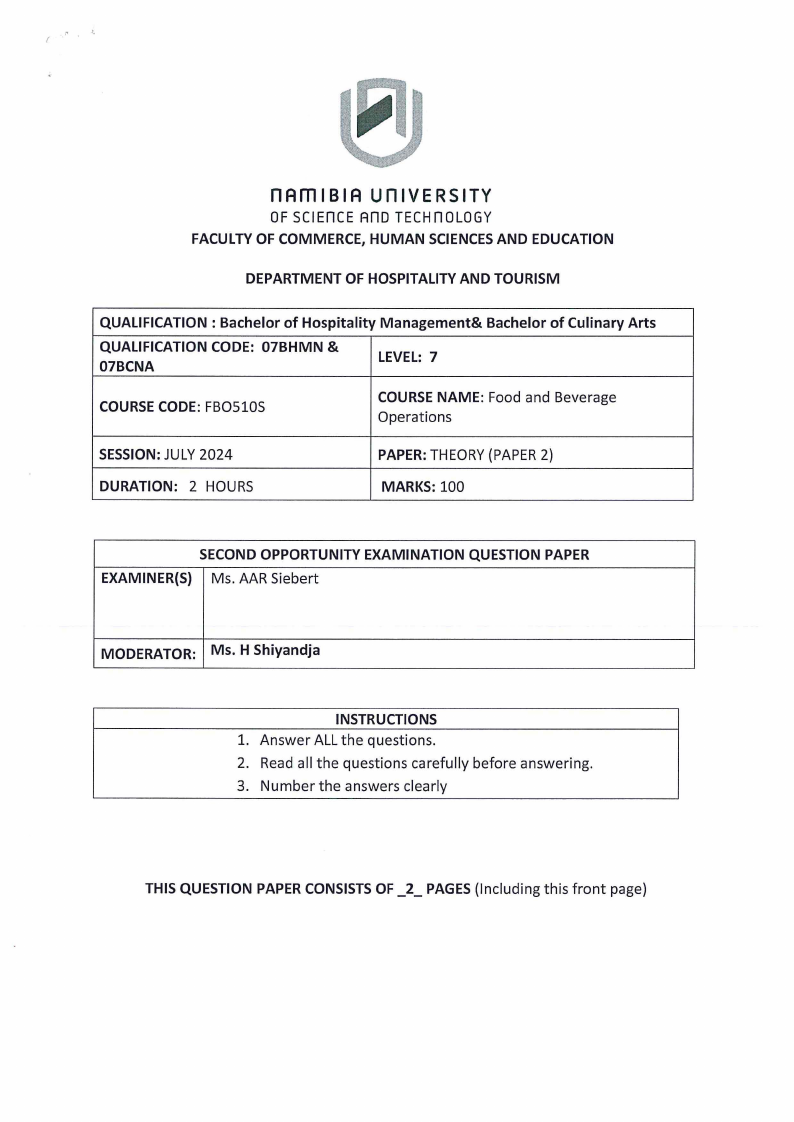FBO510S - FOOD AND BEVERAGES OPERATIONS - 2ND OPP - JULY 2024 |