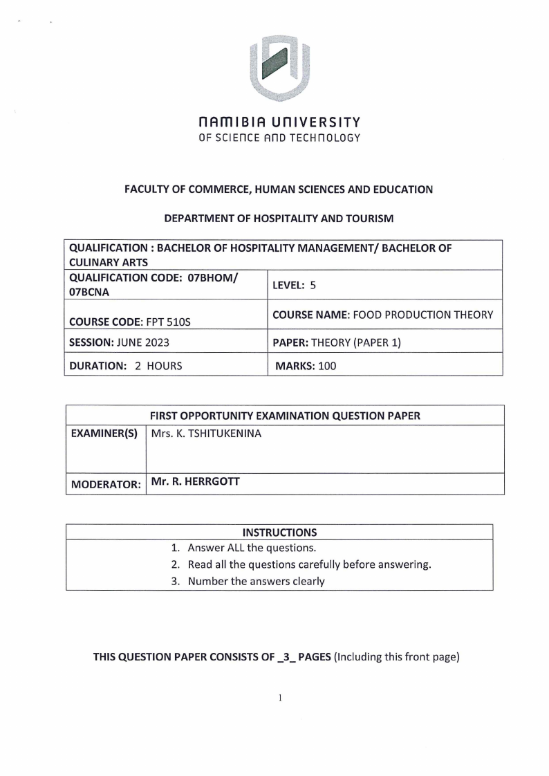 FPT510S - FOOD PRODUCTION THEORY - 1ST OPP - JUNE 2023 |