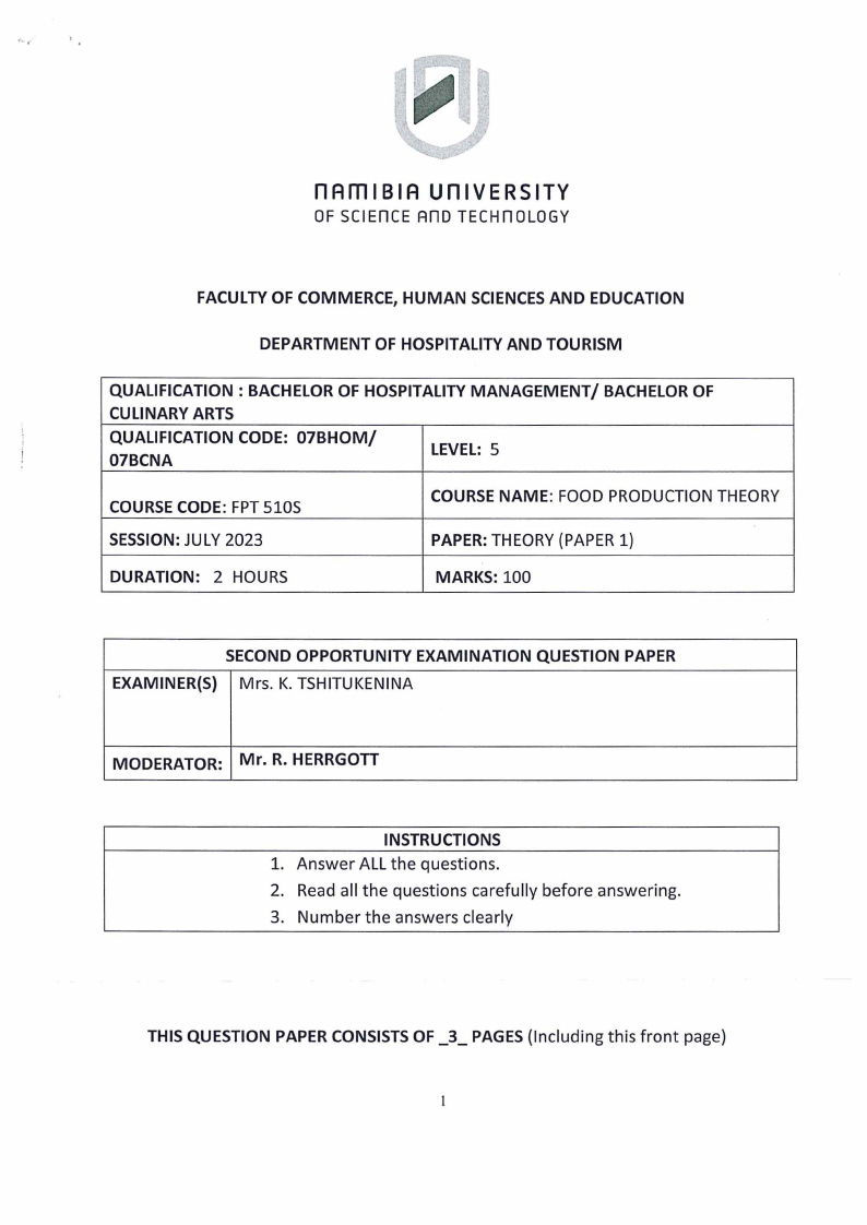 FPT510S - FOOD PRODUCTION THEORY - 2ND OPP - JULY 2023 |
