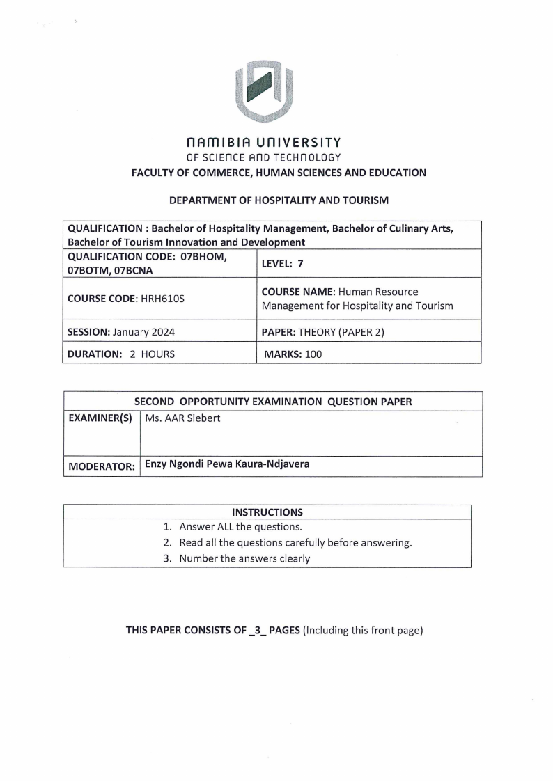 HRH610S - HUMAN RESOURCE MGT FOR HOSPITALITY AND TOURISM - 2ND OPP - JANUARY 2024 |