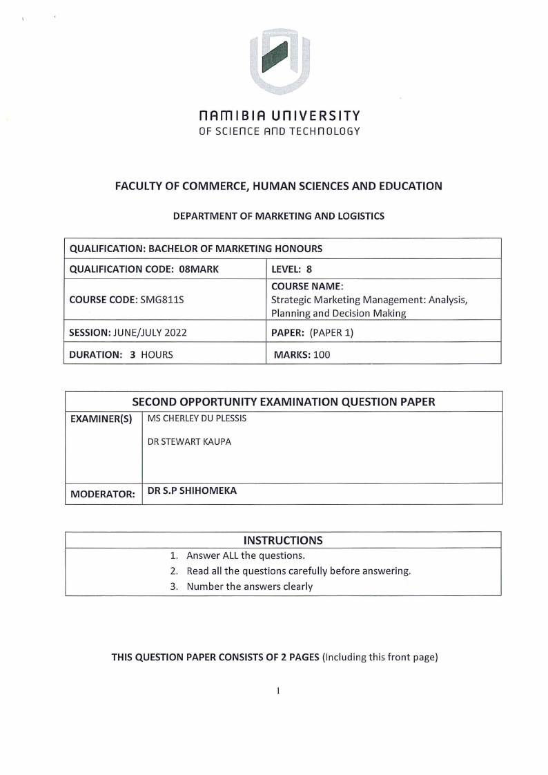 SMG811S - STRATEGIC MARKETING MANAGEMENT ANALYSIS PLANNING AND DECISION MAKING - 2ND OPP - JULY 2022 |