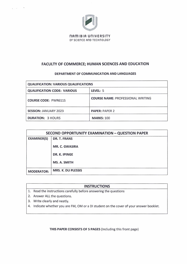 PWR611S - PROFESSIONAL WRITING - 2ND OPP - JANUARY 2023 |