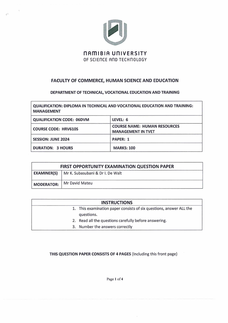 HRV610S - HUMAN RESOURCES MANAGEMENT IN VET - 1ST OPP - JUNE 2024 |