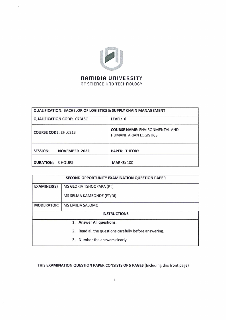 EHL621S - ENVIRONMENTAL AND HUMANITARIAN LOGISTICS - 2ND OPP SUPL - JAN 2023 |