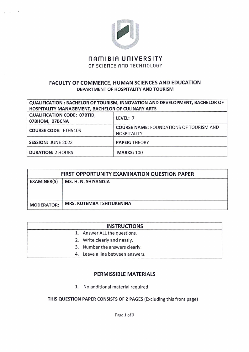 FTH510S - FOUNDATIONS AND TOURISM AND HOSPITALITY - 1ST OPP - JUNE 2022 |
