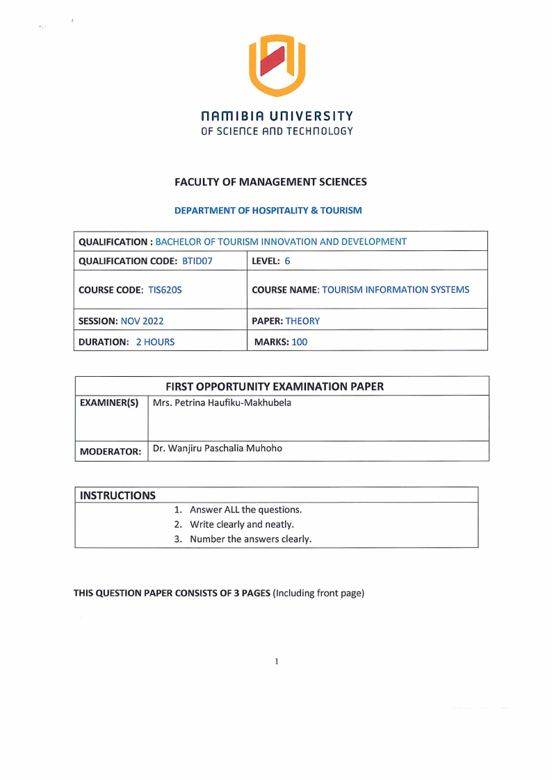 TIS620S - TOURISM INFORMATION SYSTEMS - 1ST OPP - NOVEMBER 2022 |