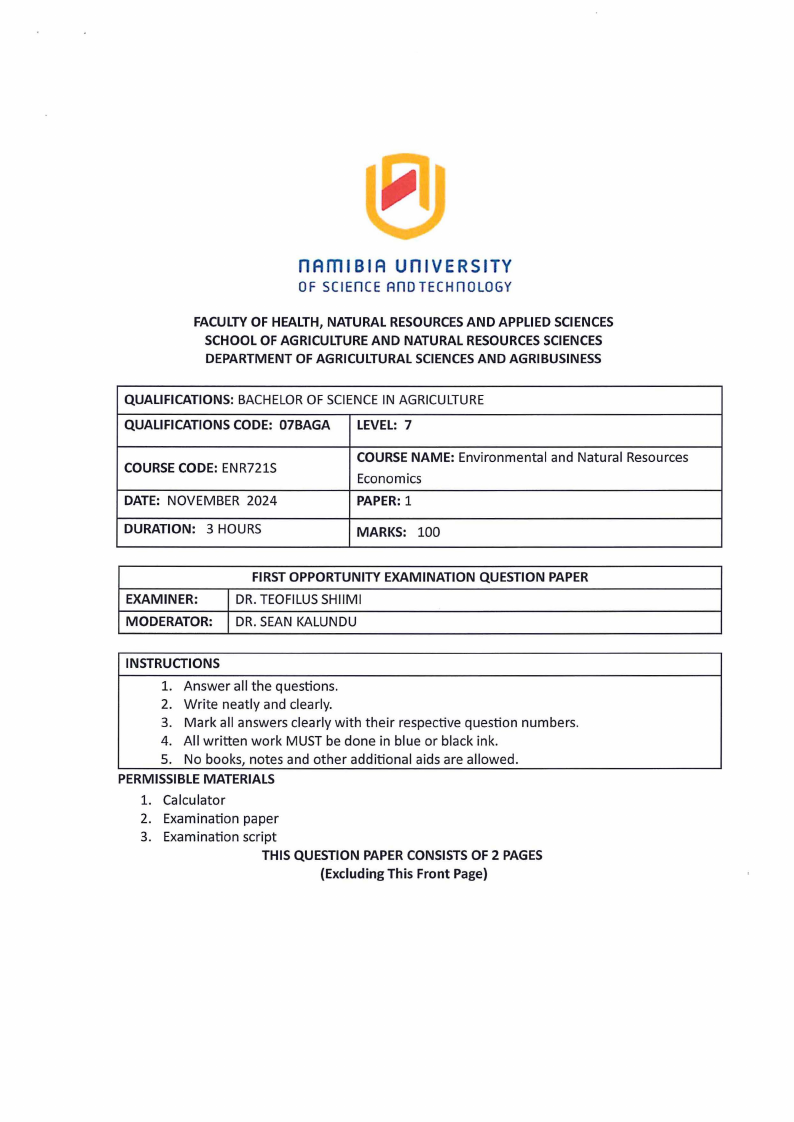 ENR721S - ENVIRONMENTAL AND NATURAL RESOURCES ECONOMICS - 1ST OPP - NOV 2024 |