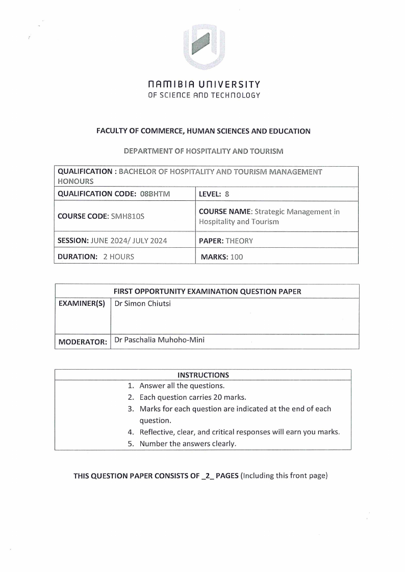 SMH810S - STRATEGIC MANAGEMENT IN HOSPITALITY AND TOURISM - 1ST OPP - JUNE 2024 |