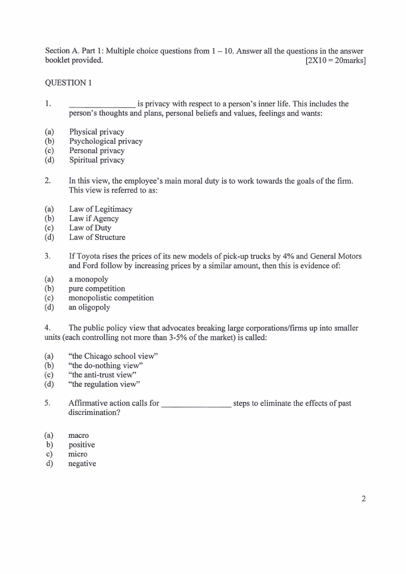 Section A. Part 1: Multiple choice questions from 1 - 10. Answer all the questions in the answer