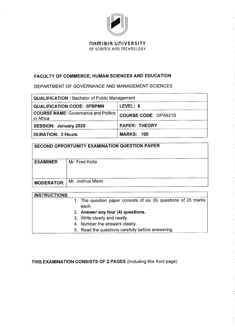 arrangements and governance in an Africa State. State the lessons learnt from Namibia