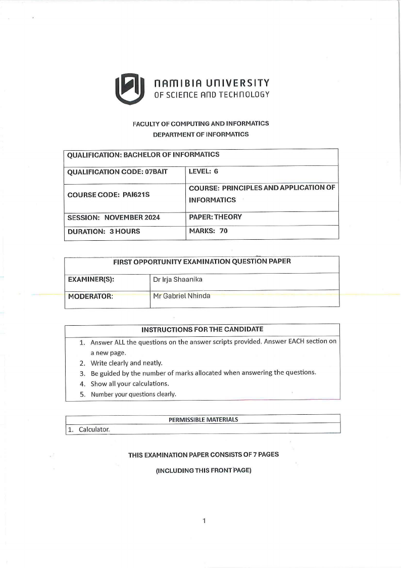 PAI621S - PRINCIPLES AND APPLICATION OF INFORMATICS - 1ST OPP - NOV 2024