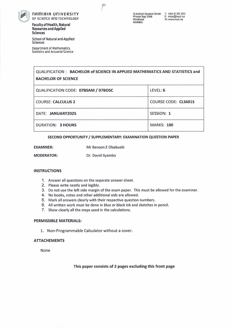 SECOND OPPORTUNITY/ SUPPLEMENTARY: EXAMINATION QUESTION PAPER
