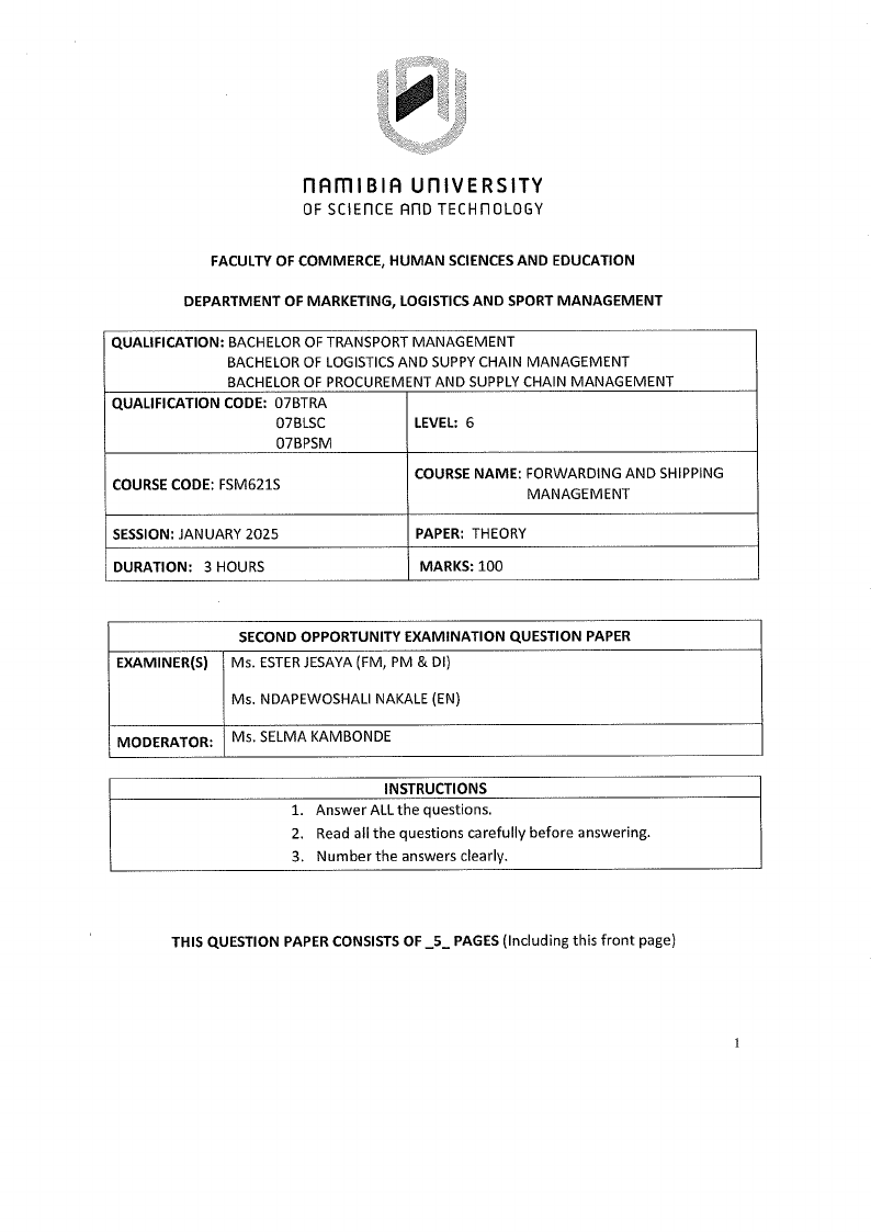 FSM621S - FORWARDING AND SHIPPING MANAGEMENT - 2ND OPP - JANUARY 2025 |
