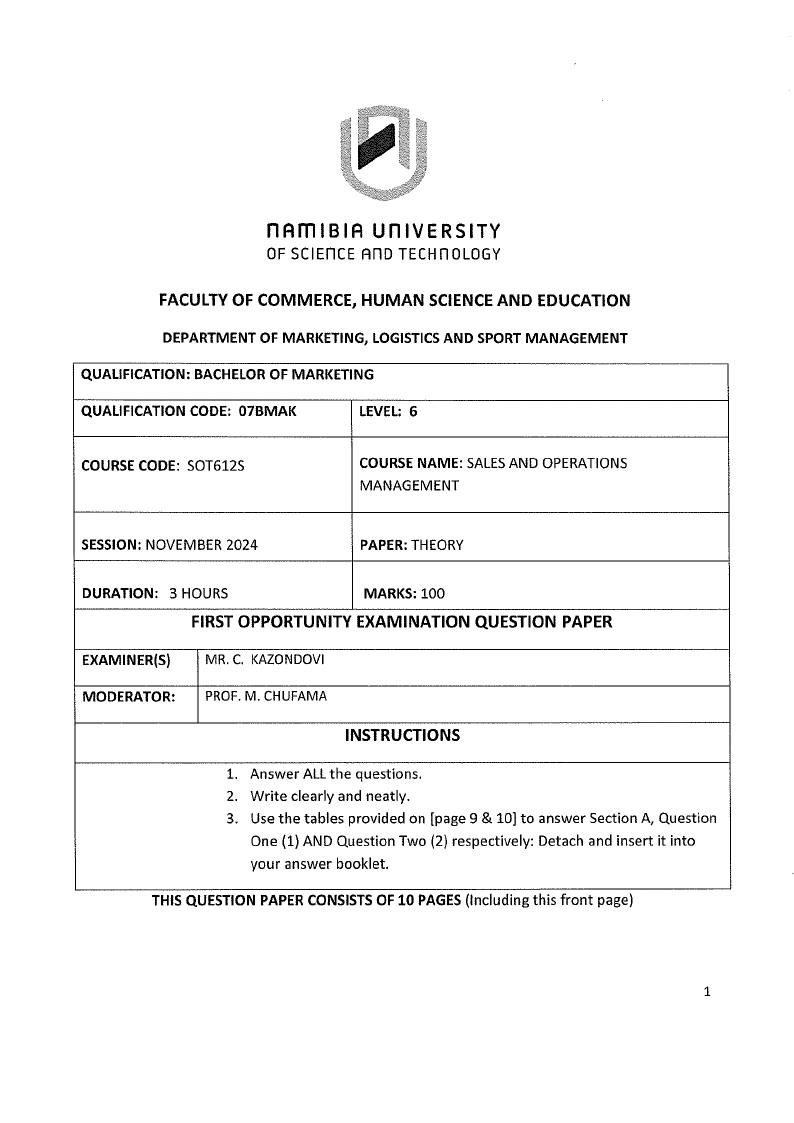 SOT612S - SALES AND OPEARATIONS MANAGEMENT - 1ST OPP - NOVEMBER 2024 |