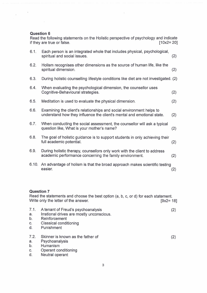 Read the following statements on the Holistic perspective of psychology and indicate