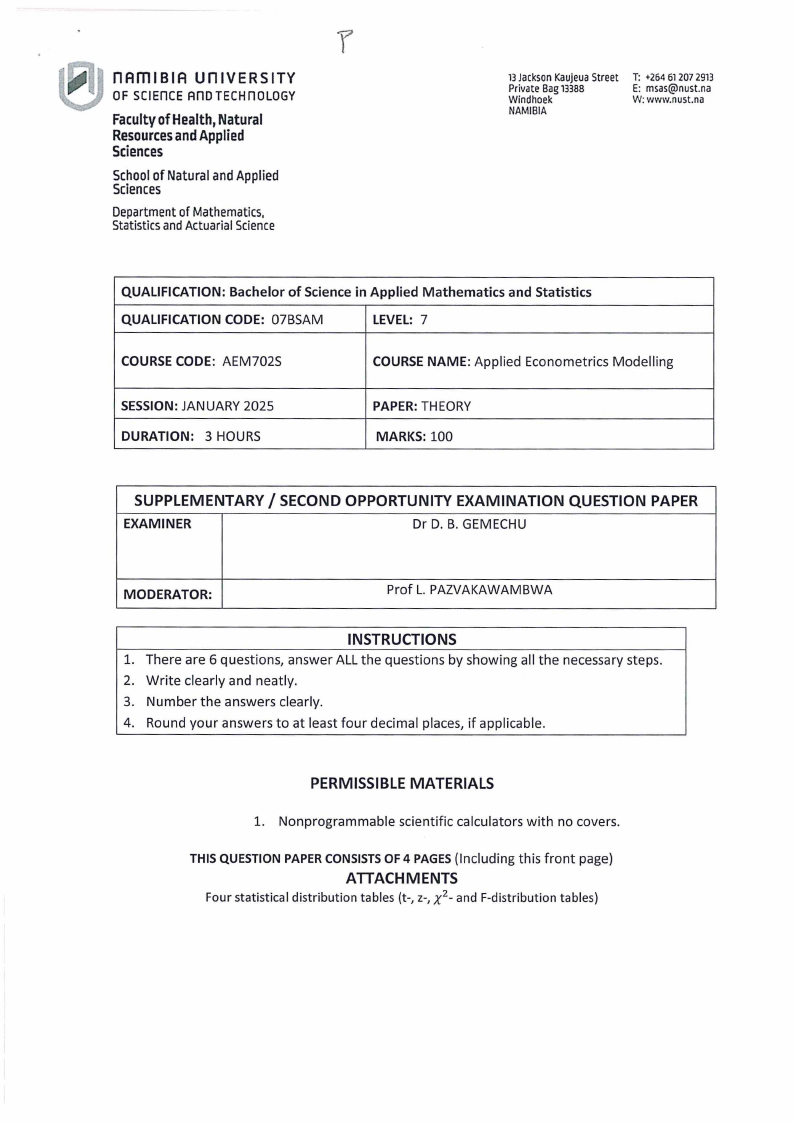 AEM702S - APPLIED ECONOMETRICS MODELING - 2ND OPP - JANUARY 2025