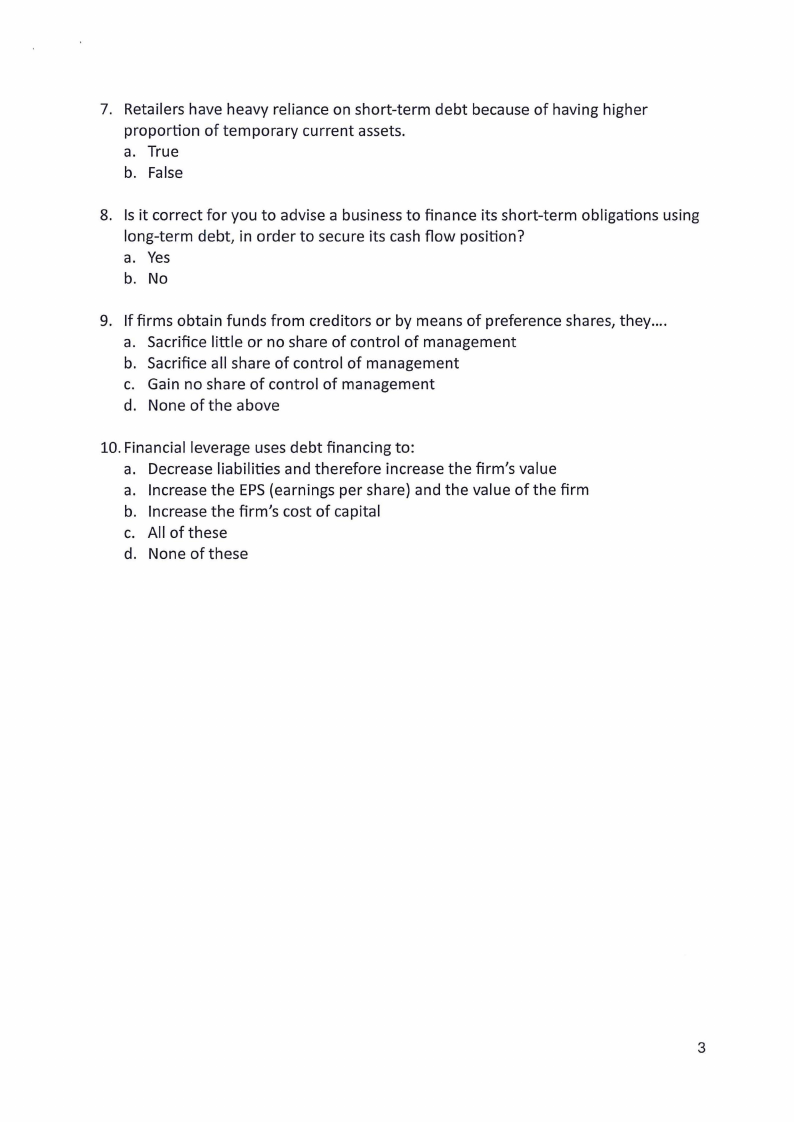 8. Is it correct for you to advise a business to finance its short-term obligations using
