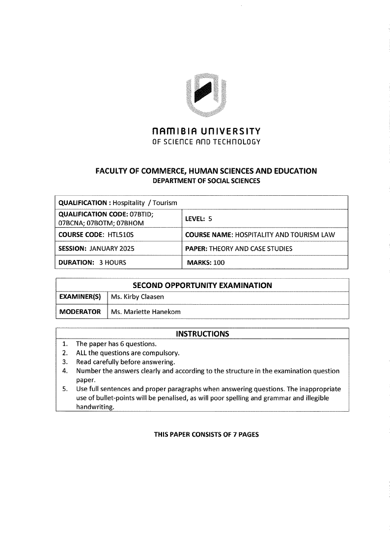 HTL510S - HOSPITALITY AND TOURISM LAW - 2ND OPP - JANUARY 2025 |
