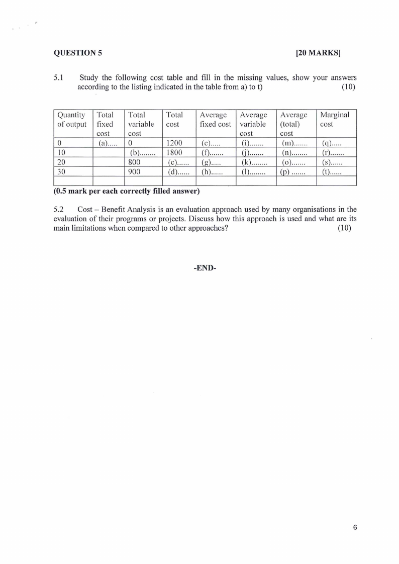 5.1 Study the following cost table and fill in the missing values, show your answers