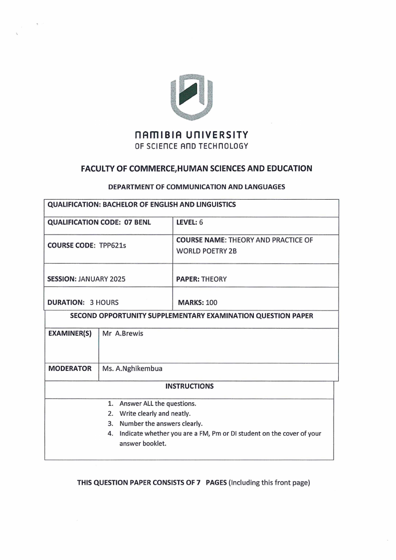 TPP621S - THEORY AND PRACTICE OF WORLD POETRY 2B - 2ND OPP - JAN 2025