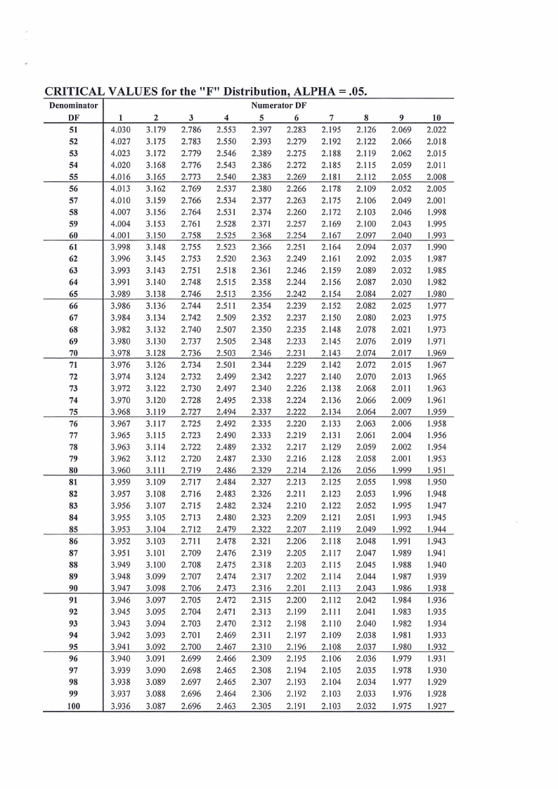 CRITICAL VALUES for the "F" Distribution, ALPHA = .05.