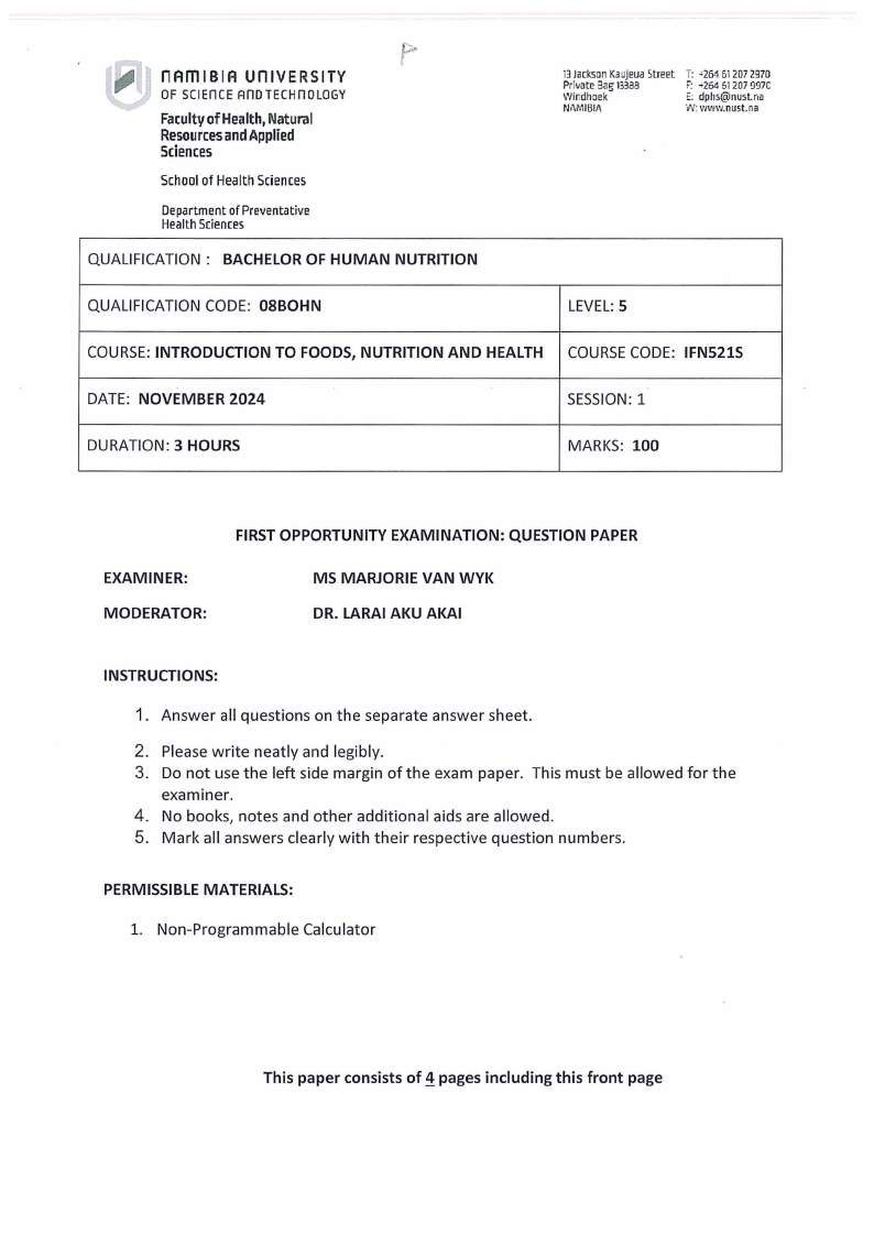 Introduction to Foods, Nutrition and Health (IFN521S) 1st Opportunity Exam November 2024