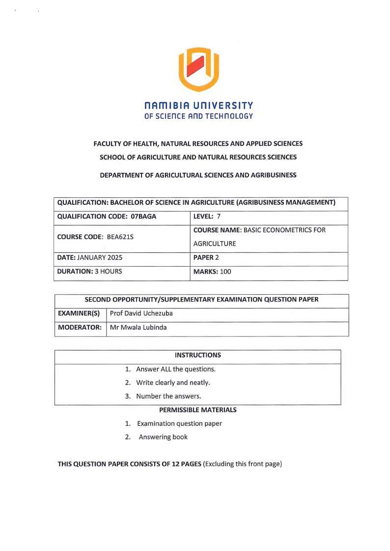 BEA621S - BASIC ECONOMETRICS FOR AGRICULTURE - 2ND OPP - NOV 2024 |