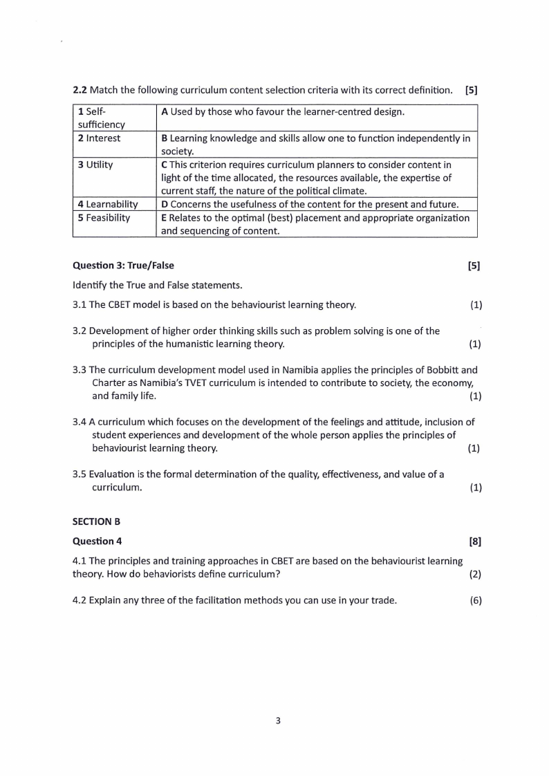 3.3 The curriculum development model used in Namibia applies the principles of Bobbitt and