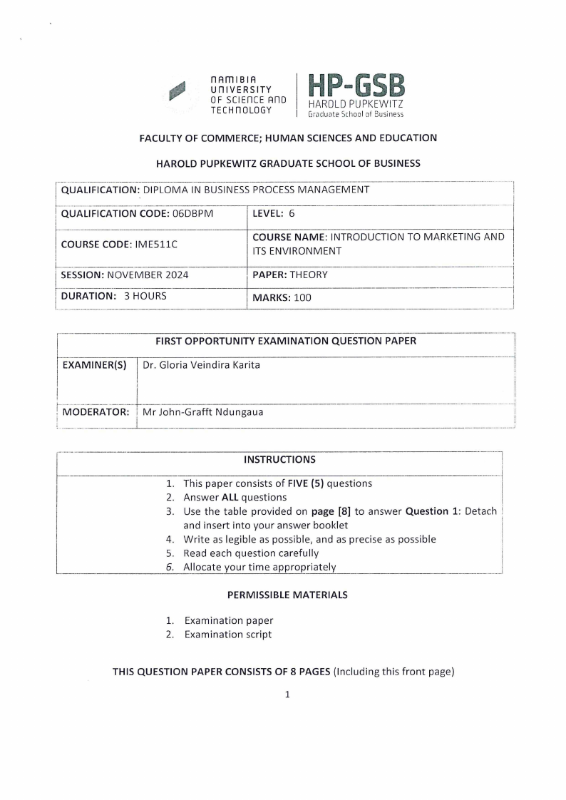 IME411C-INTRODUCTION TO MARKETING AND ENVIROMENT-1ST OPP-NOV 2024 |