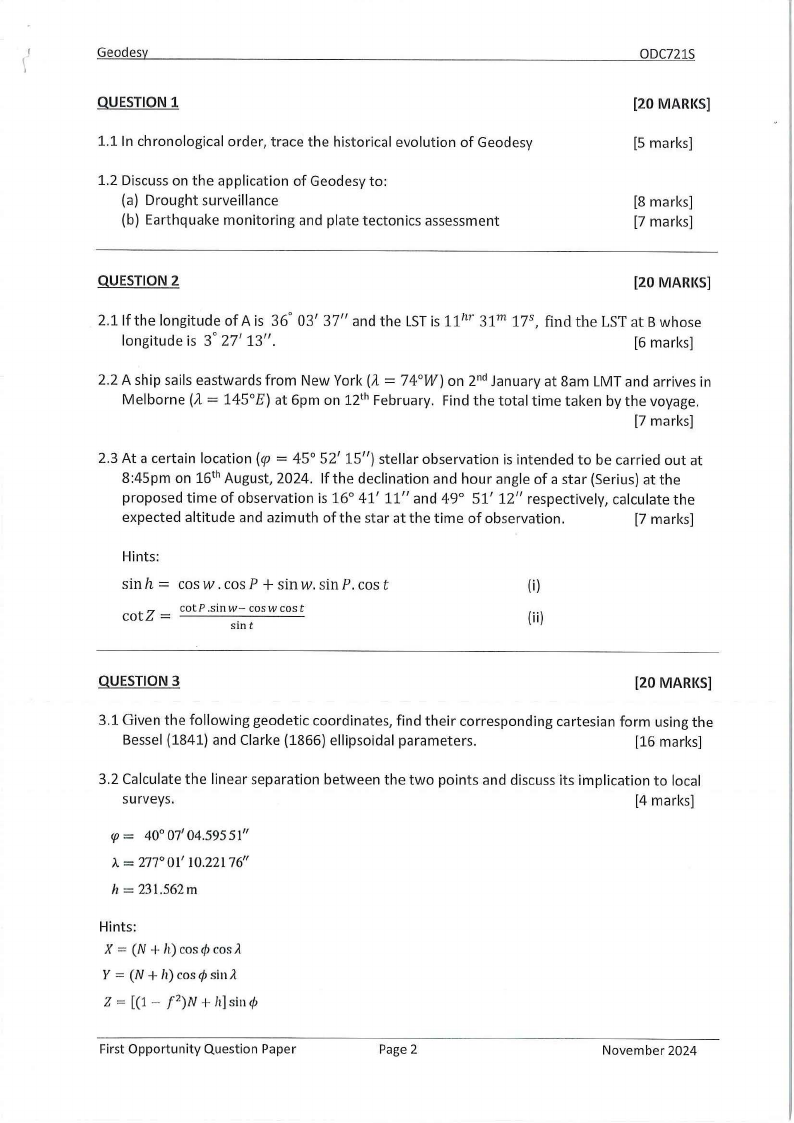 3.1 Given the following geodetic coordinates, find their corresponding cartesian form using the