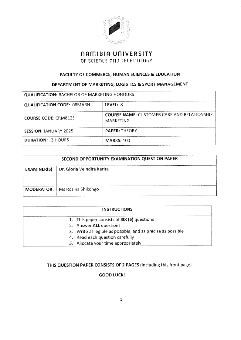 CRM812S- CUSTOMER CARE AND RELATIONSHIP MARKETING - 2ND OPP -JANUARY 2025